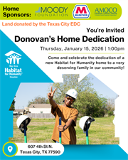Donovan’s Habitat home in Texas City is nearly complete, and we’re thrilled to invite you to his Home Dedication on January 15 at 1pm as he receives the keys to the home he helped build alongside the community.